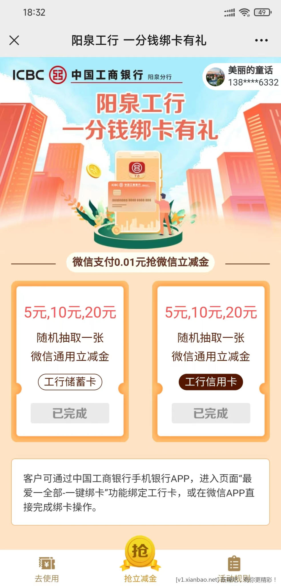 工行最少5+5大毛,亲测有效。本人10-10 一个微信工行储蓄卡和XY卡各一次 扫二维码参加