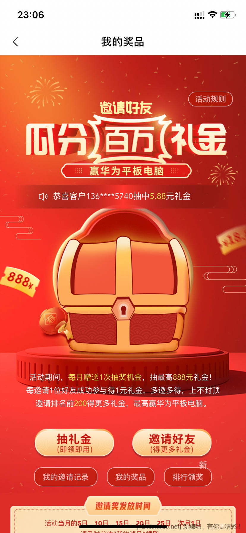 保底5.88元,农行app瓜分百万礼金,每月赠送一次机会,路径生活—本地优惠—瓜分百万礼金
