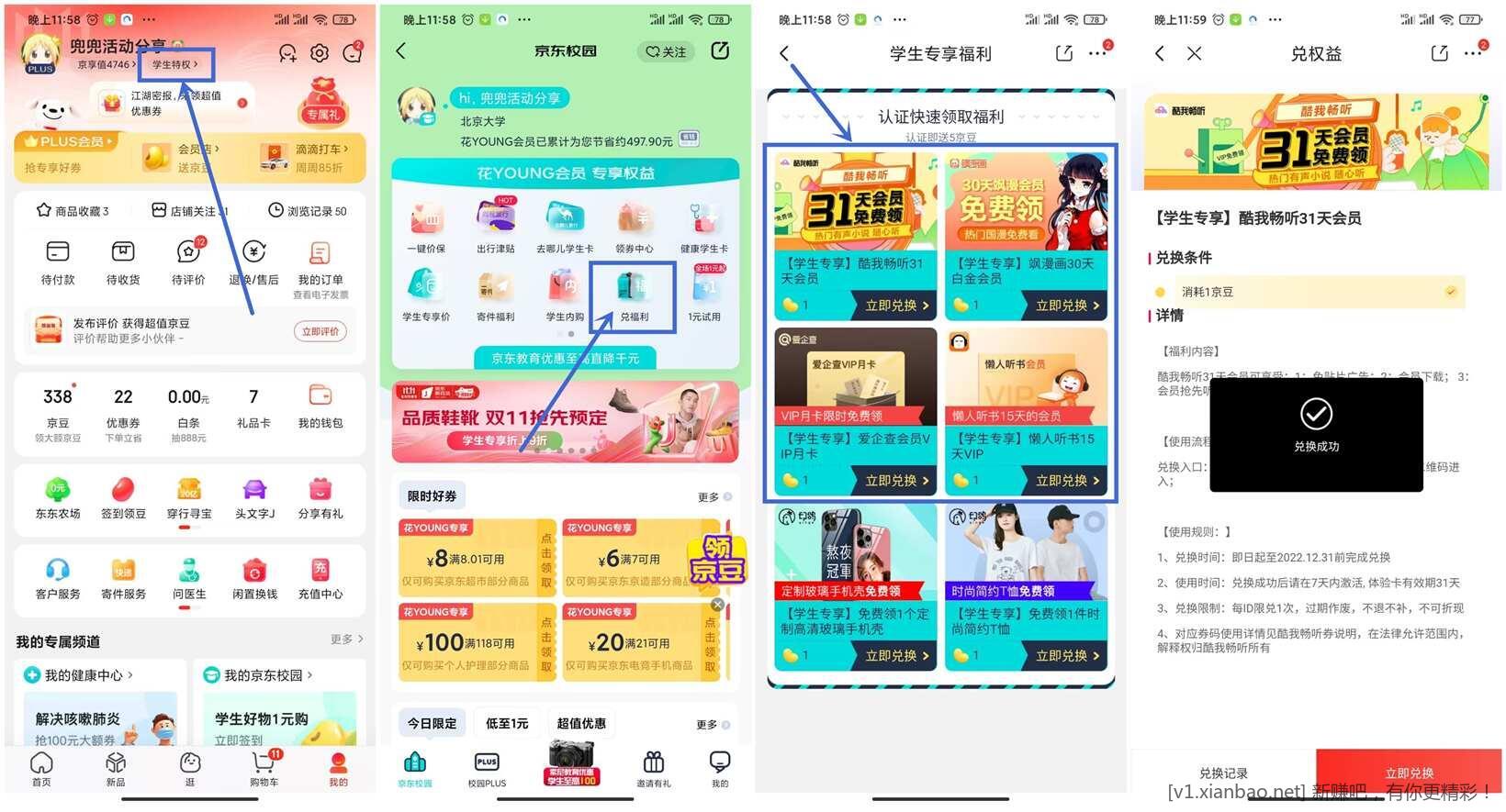 【京东学生特权兑换4个VIP权益】京东APP->我的->学生特权->兑福利->有酷我畅听会员、飒漫画白金会员、爱企查会员和懒人听书会员等->每个权益都能兑换一次!
