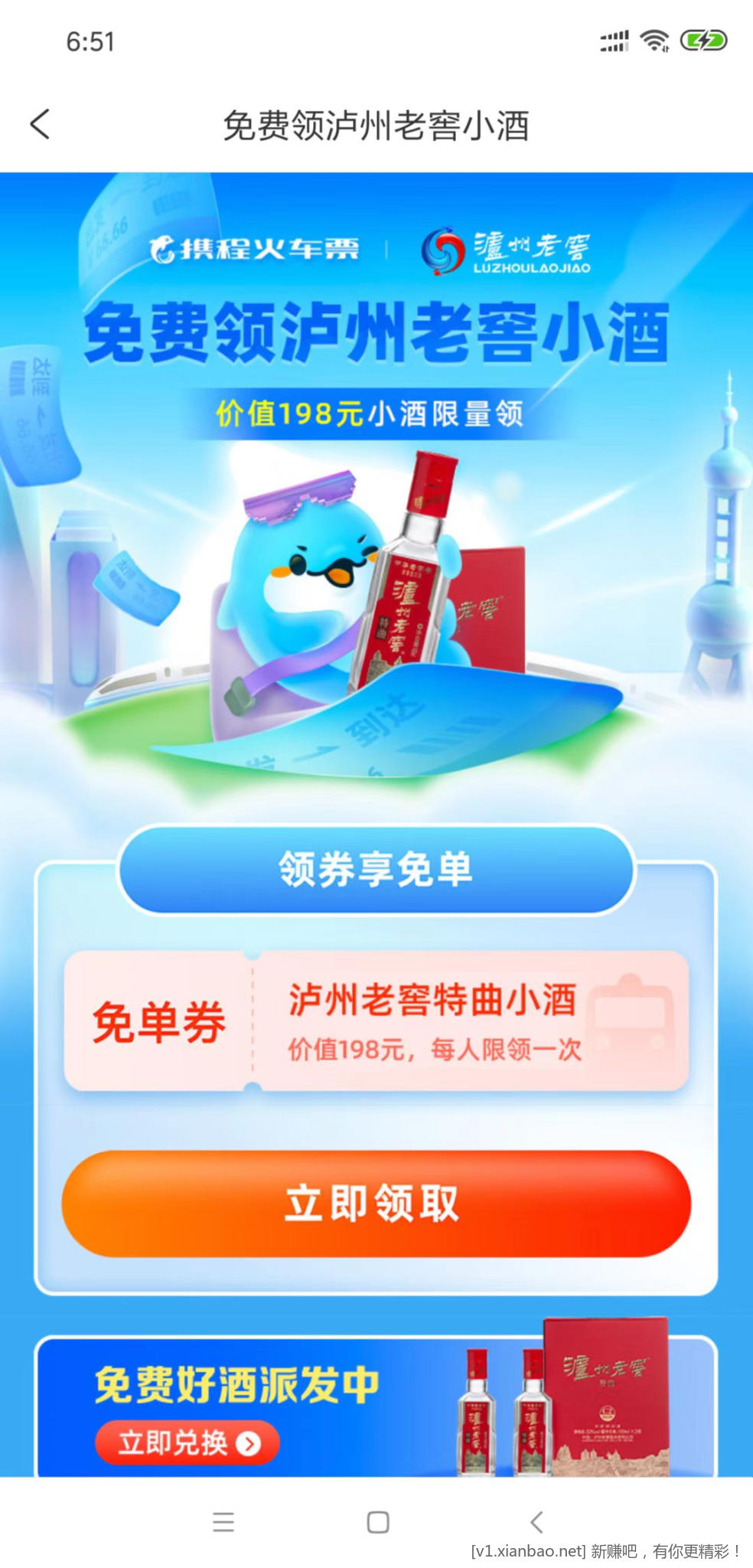 携程APP买火车票,买图上的车票4元,然后去订单详情页领券,0元2瓶泸州老窖特曲小酒礼盒,速度!