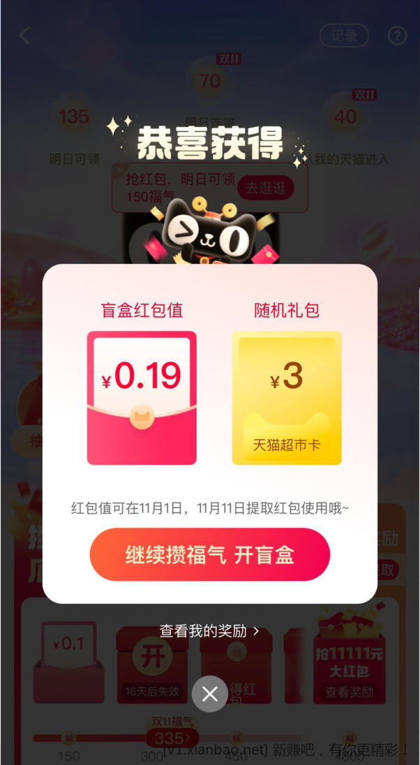 天猫APP首页“福气”->做任务得福气->指定福气值开盲盒抽红包+随机礼包,目前第二个盲盒有水