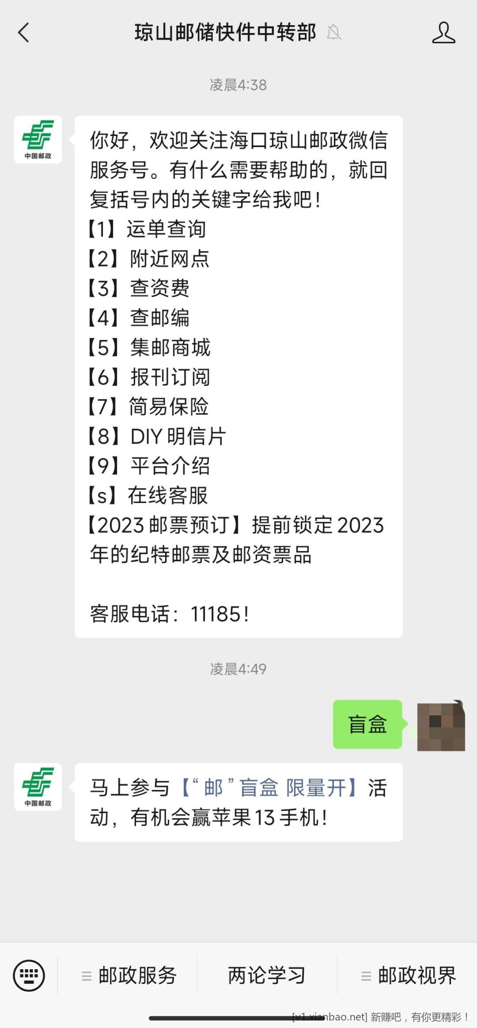 参与方式:关注微信公众号【琼山邮储快件中转部】,发送关键字【盲盒】,点进去文章拉到最下方图片进入