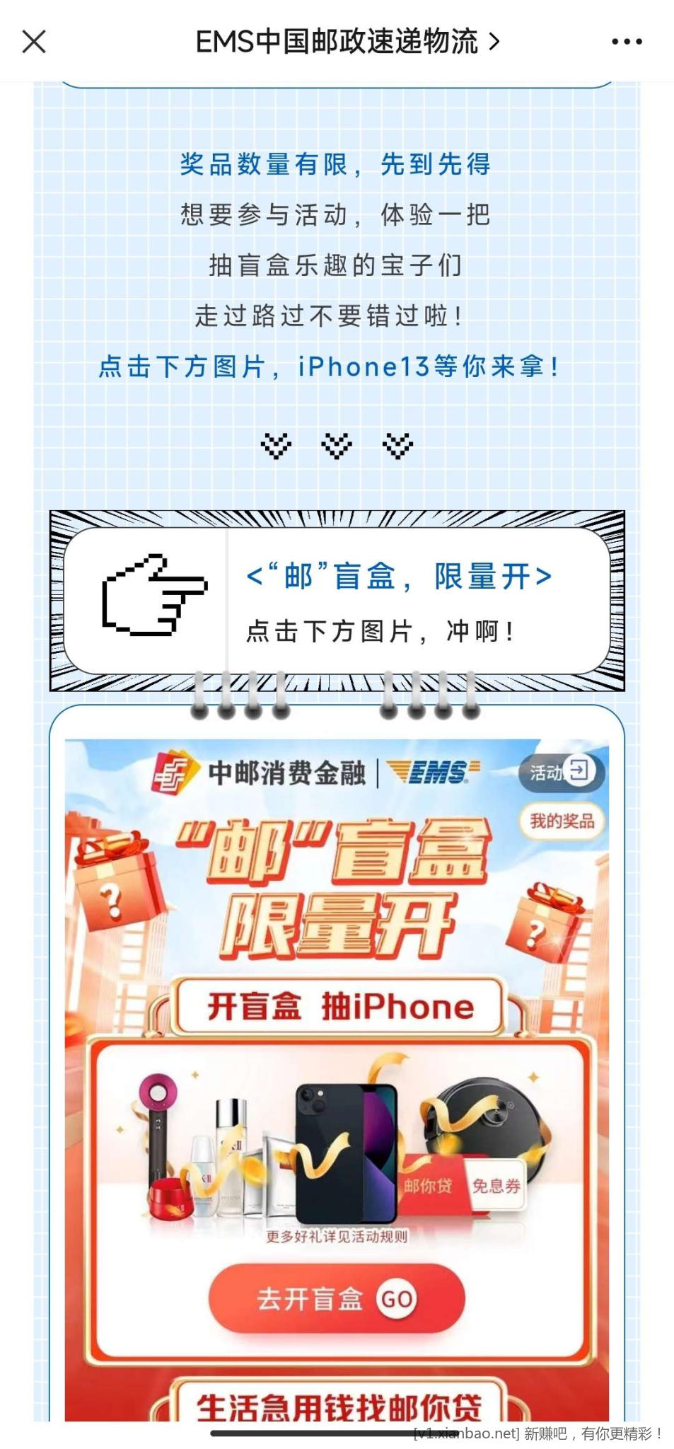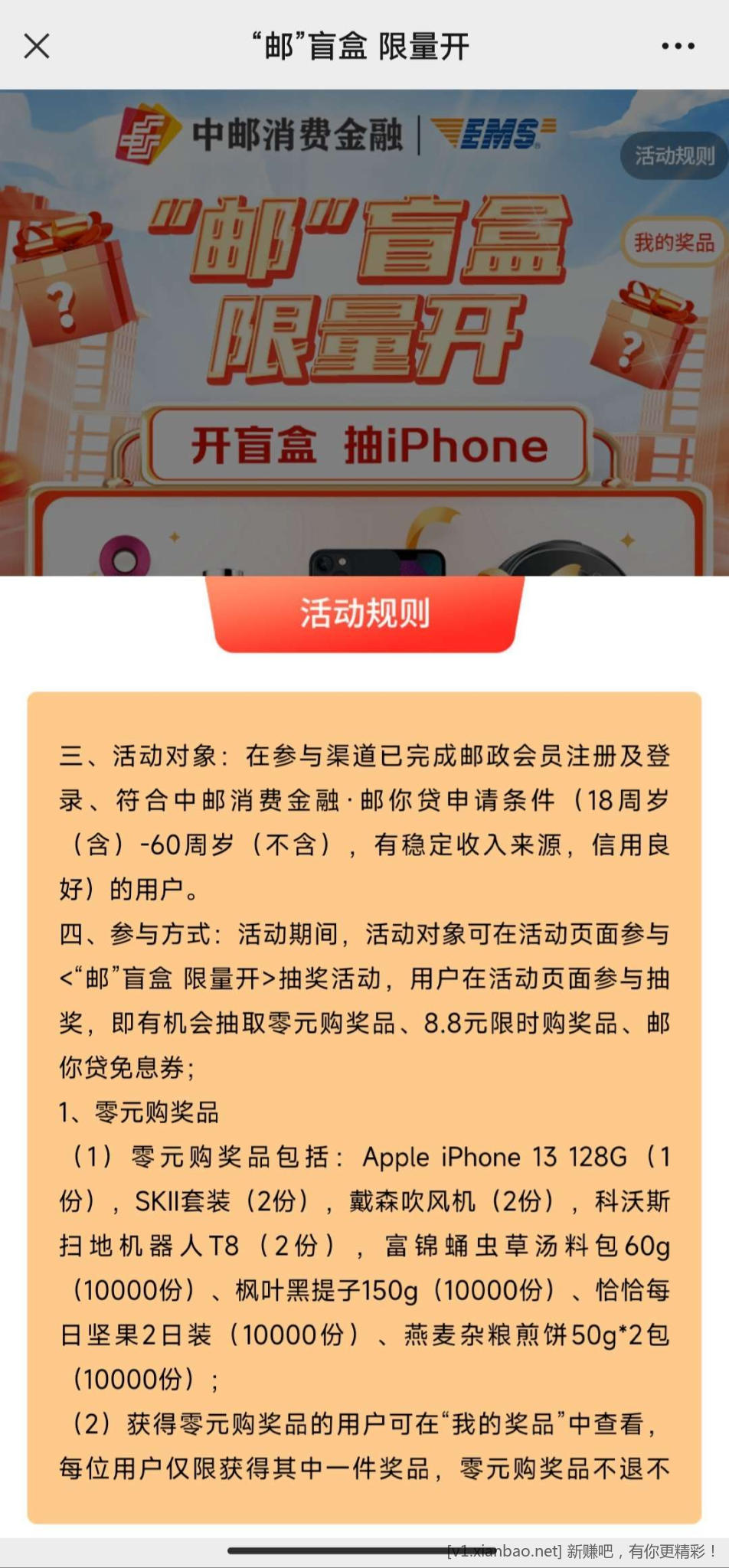 活动内容:邮政领盲盒,一直都有水哈,时间很长,最高抽苹果13,大概率中