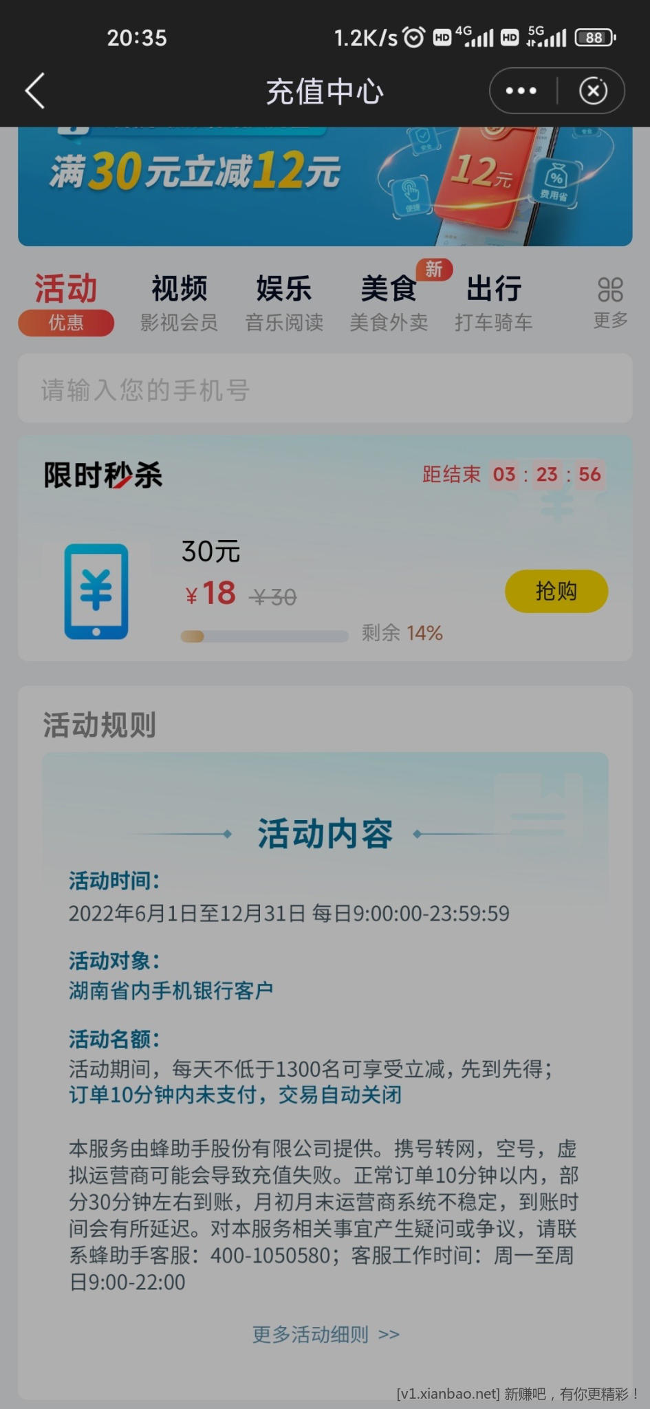 首发,湖南邮储18充30话费,看图