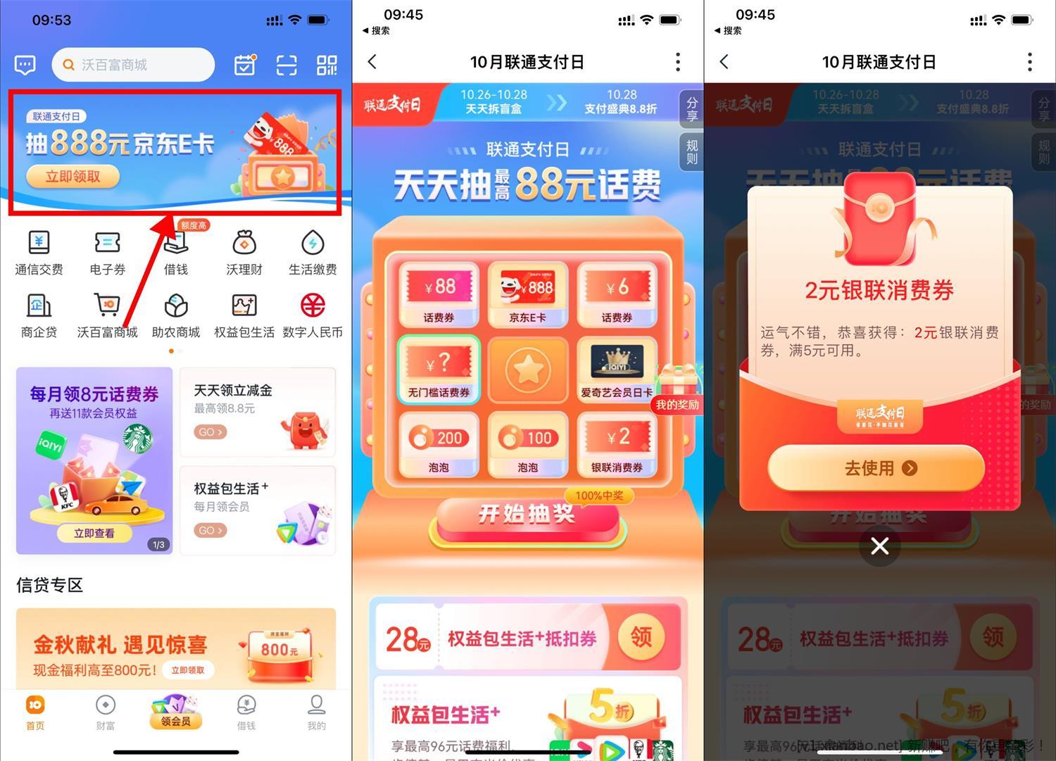 沃钱包APP->首页横幅进入->直接抽10减6元话费券或5减2元银联消费券