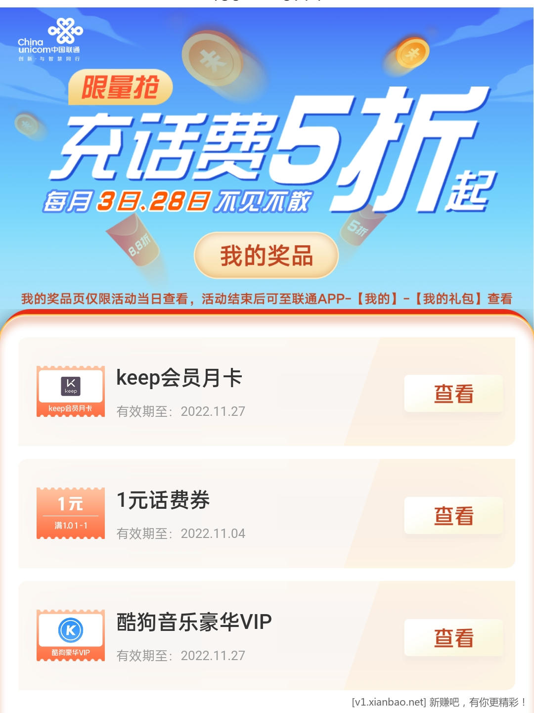 刚中两张月卡和一元话费券