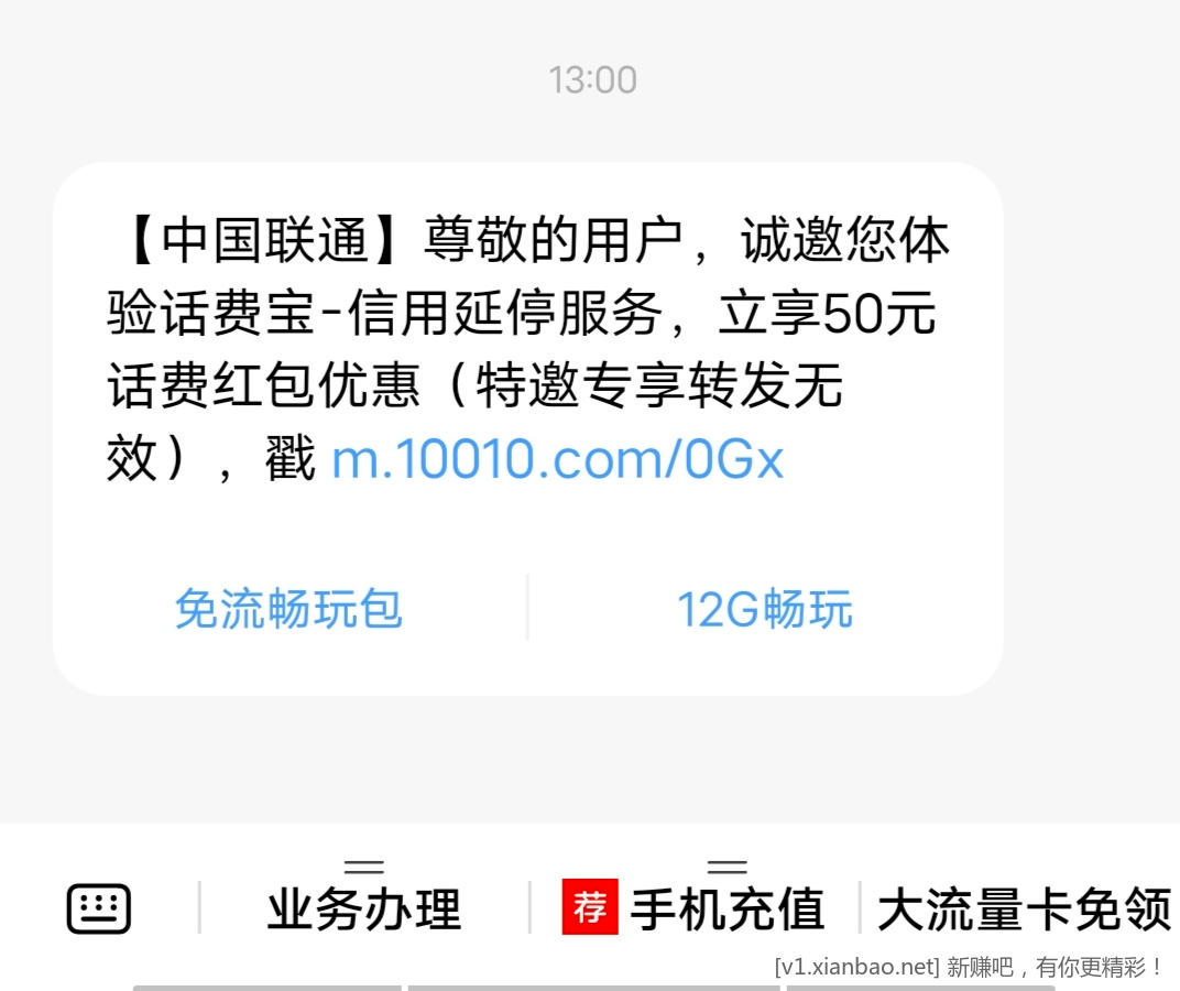 【中国联通】尊敬的用户,诚邀您体验话费宝-信用延停服务,立享50元话费红包优惠(特邀专享转发无效),戳 m.10010.com/0Gx