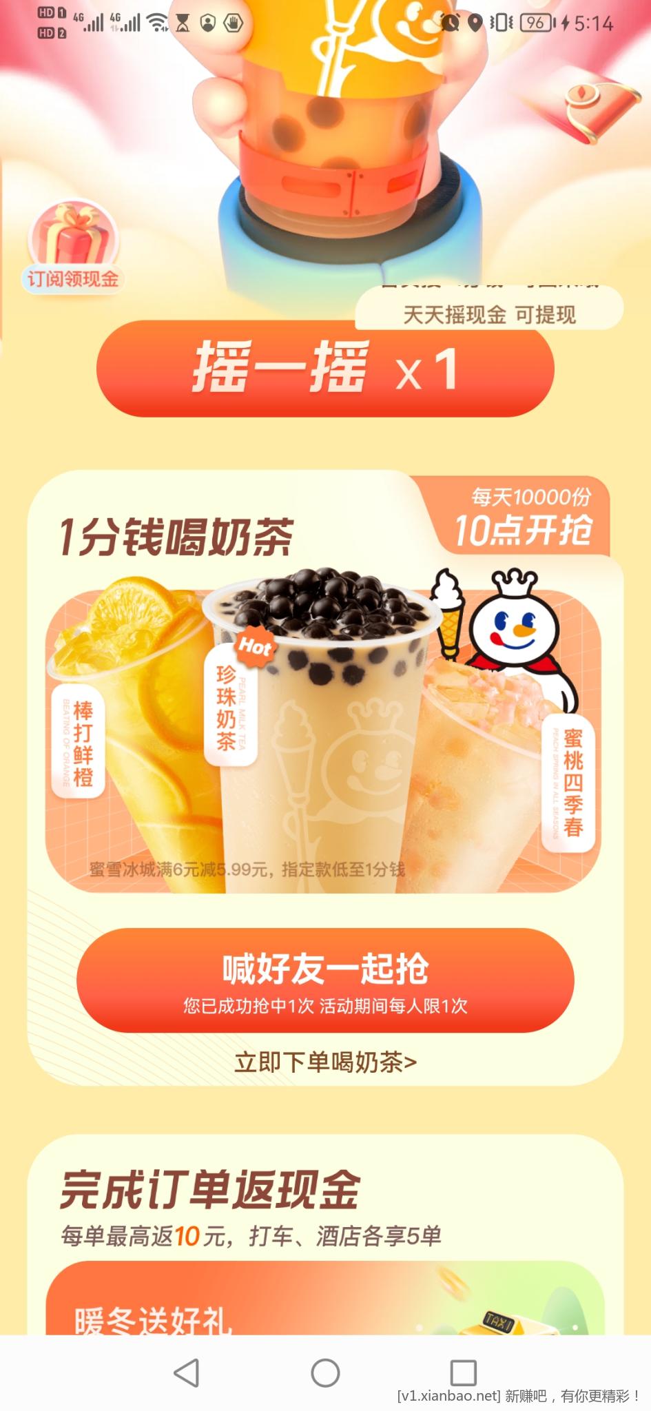 腾讯地图app-我的-活动专区-领现金 喝奶茶1分钱起领的是6-5.99的券,每天限量,但是我刚刚还能领到。摇一摇也有摇到蜜雪冰城2块钱的优惠券,还有一张5折的打车券。
