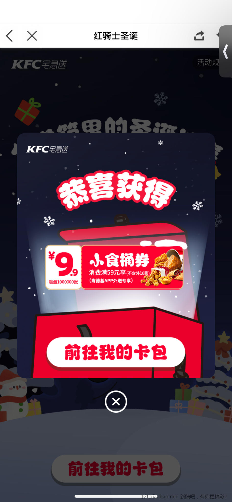 KFCAPP下拉二楼有个活动,像天天酷跑,一分钟内收集小食满70个获得0元小食桶券,不满70个9.9,随单满59元可用。障碍物雪球会定身浪费时间,龙卷风会减速