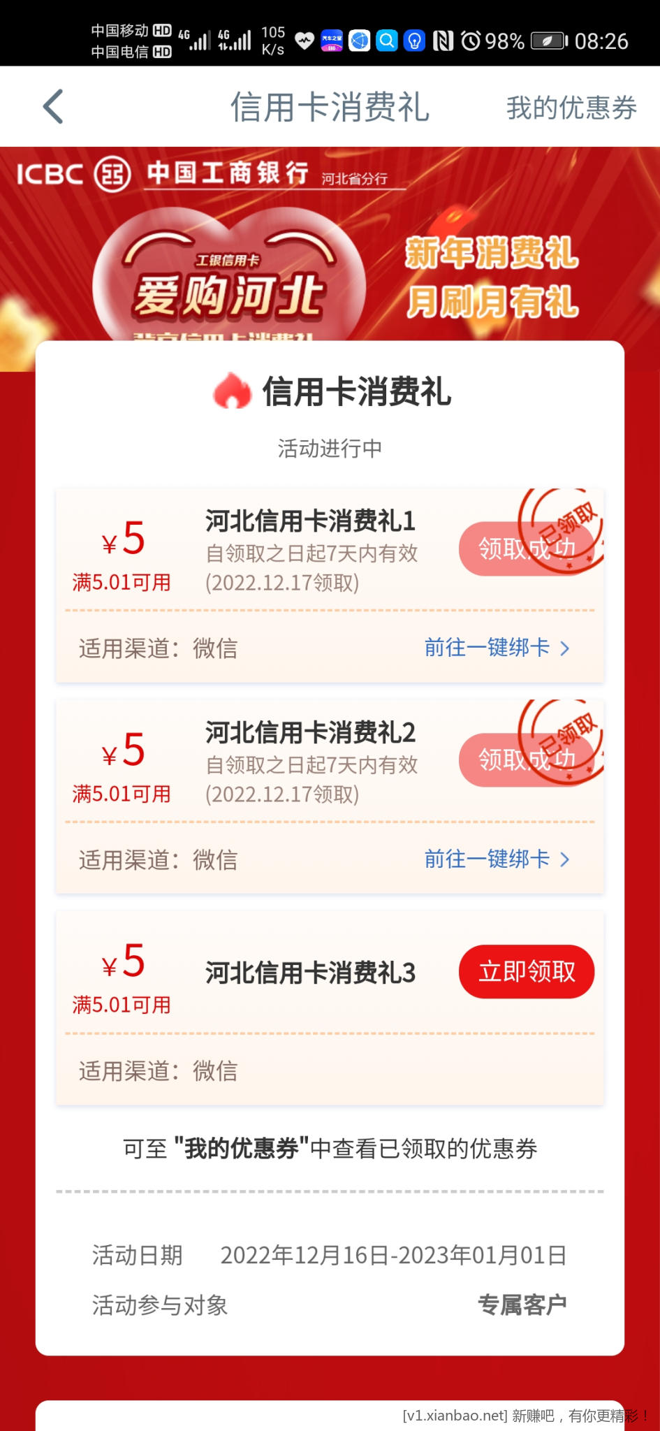 工行xyk用户打开工行APP搜工行消费季,进入会看到3个5元的微信立减金活动,可以直接领取。