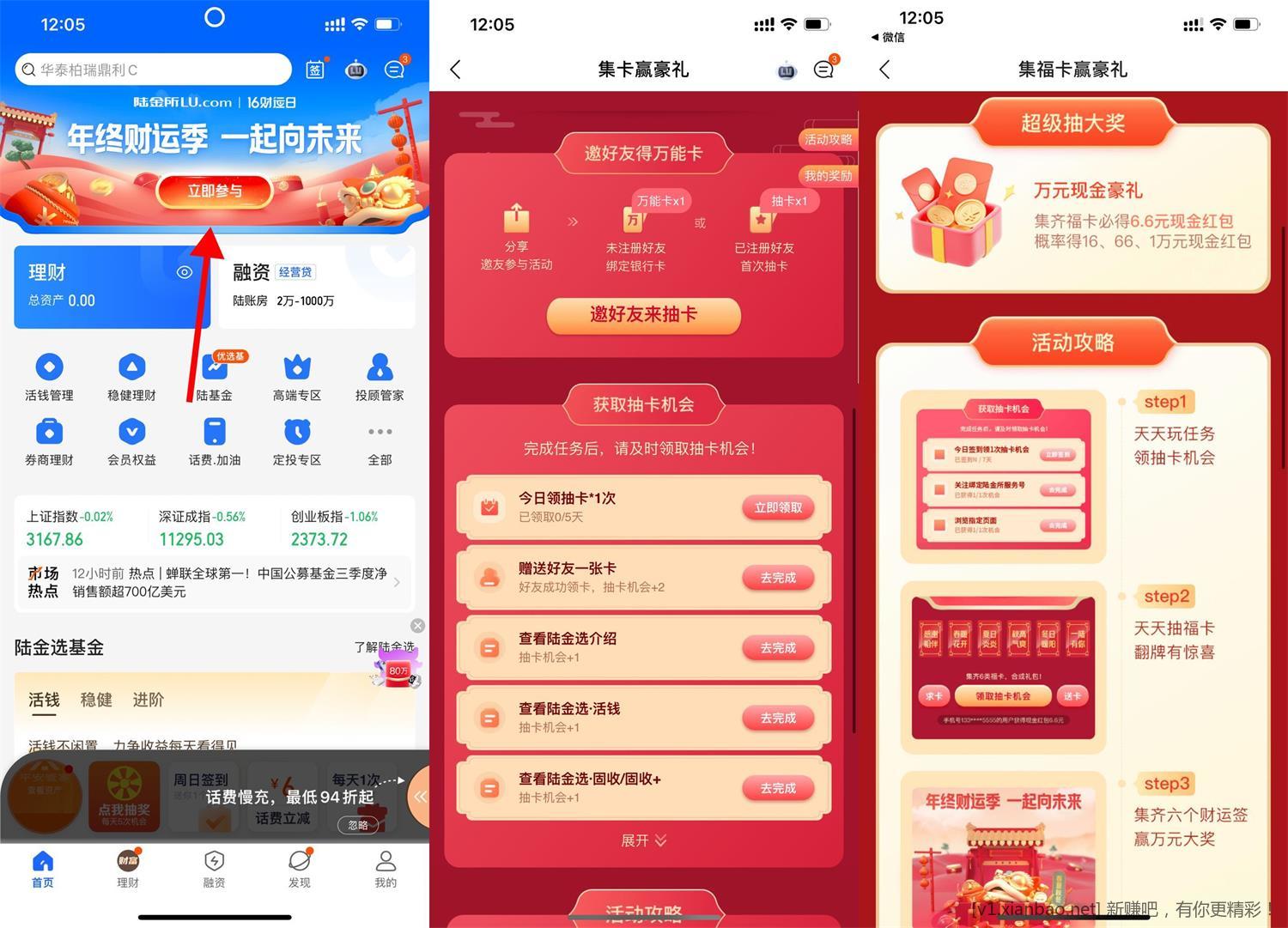 陆金所APP->首页横幅进入->做任务得抽卡次数->集齐6张卡片必得6.6元