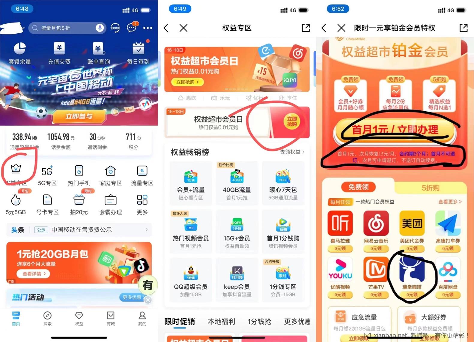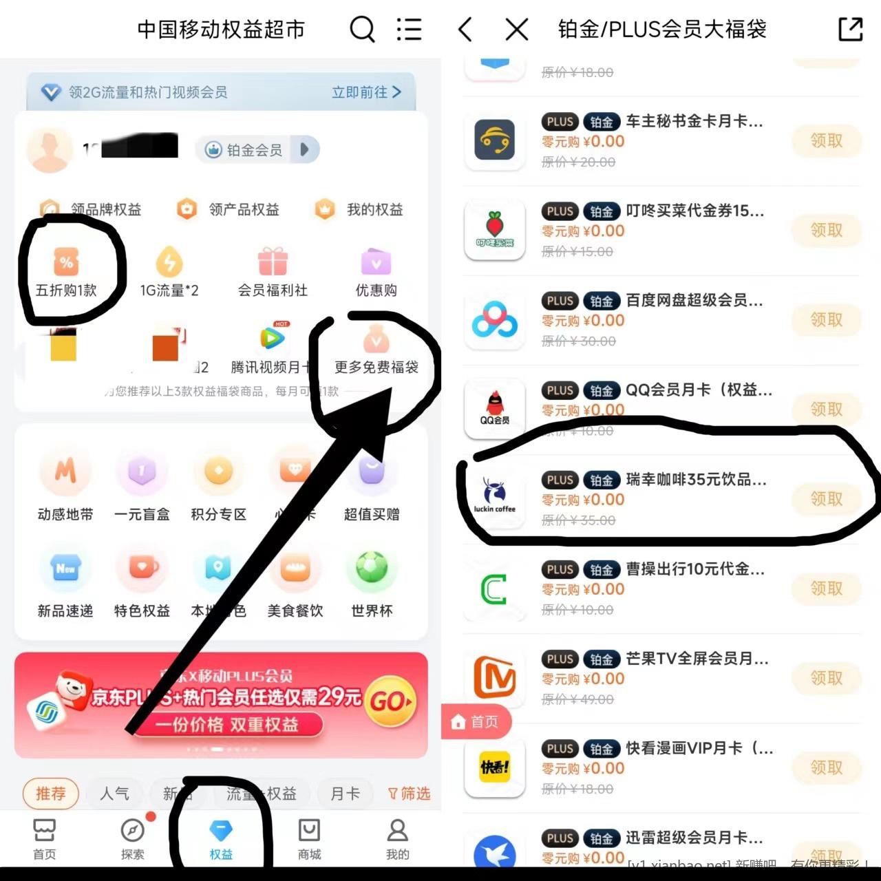 中国移动app,首页点权益专区,横幅,进去1元开通铂金会员 可领瑞幸咖啡券35