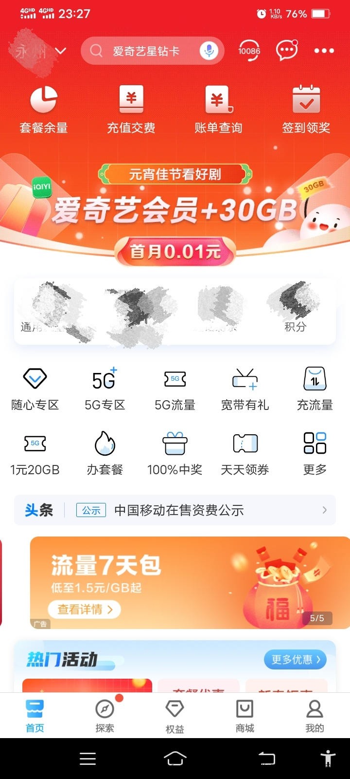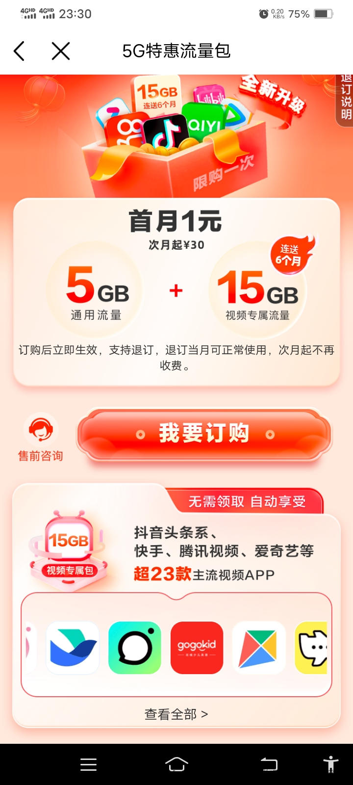 首页点那个1元20GB,订购后可马上退订,不要看这是5G流量规责写了是2.3.4.5通用的,5GB通用流量,和15GB定向流量支持抖音,快手,爱奇艺,腾讯系列