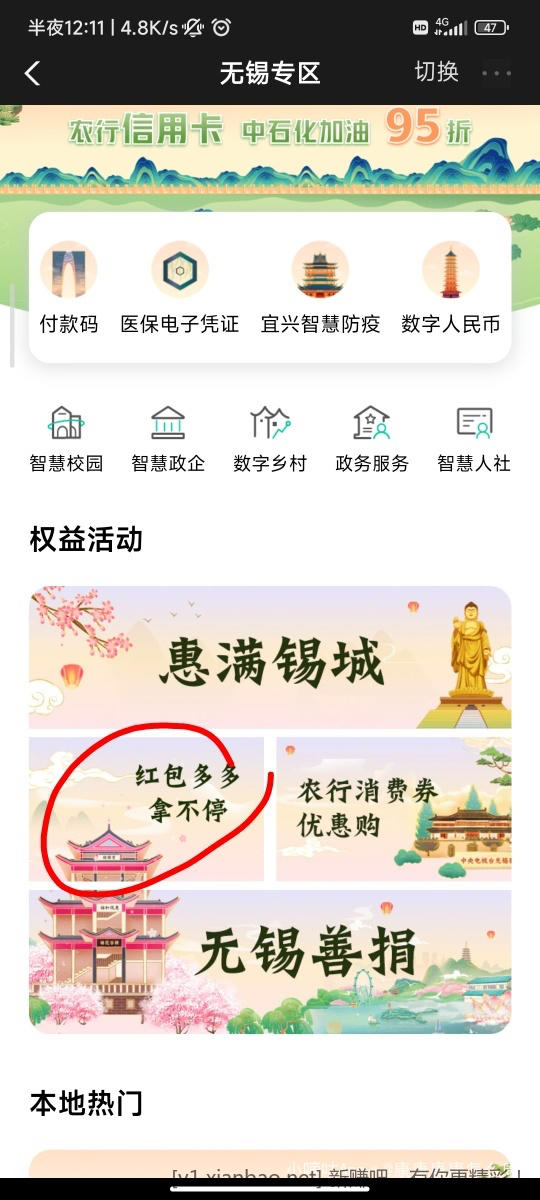 农行飞江苏,填代码106308,城市专区改无锡,掉横幅惠满锡城,第一个活动 锡城和下面红包 两个活动