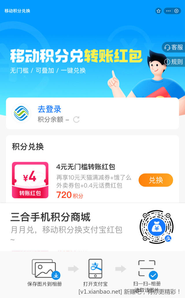 移动积分兑换支付宝转账红包、通用红包、无门槛话费券