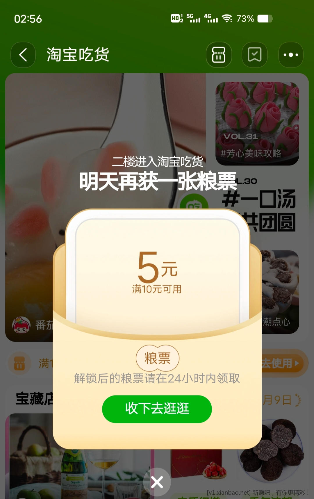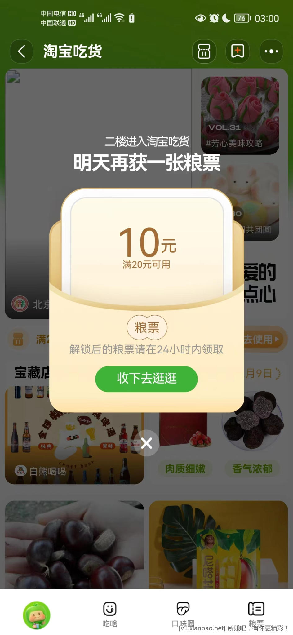 领淘宝吃货粮票红包20-10/10-5,可叠加店铺优惠