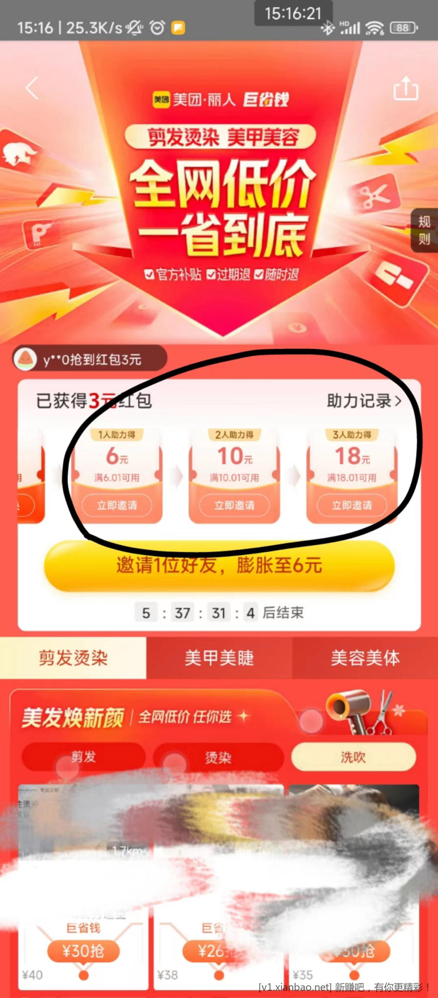 某团APP,搜丽人频道,点巨省钱,3助力18元券(理发)