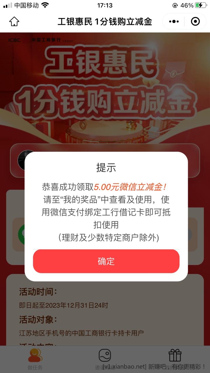 江苏工行卡 微信工享苏惠小程序 每个月都能领随机立减金