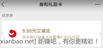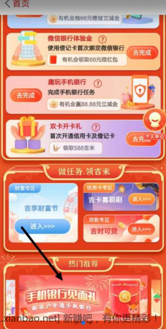 红包2:——返回app-首页推文新人大礼包-下拉到底-滚动推文《手机银行见面礼》进去领取奖励-领取成功后——去微信关注吉林银行公众号-右下角-领好礼-进去注册-跟app一样的步骤下拉到底找到-《手机银行见面礼》-进去卡包兑换8.8立减金就行,兑换后秒到