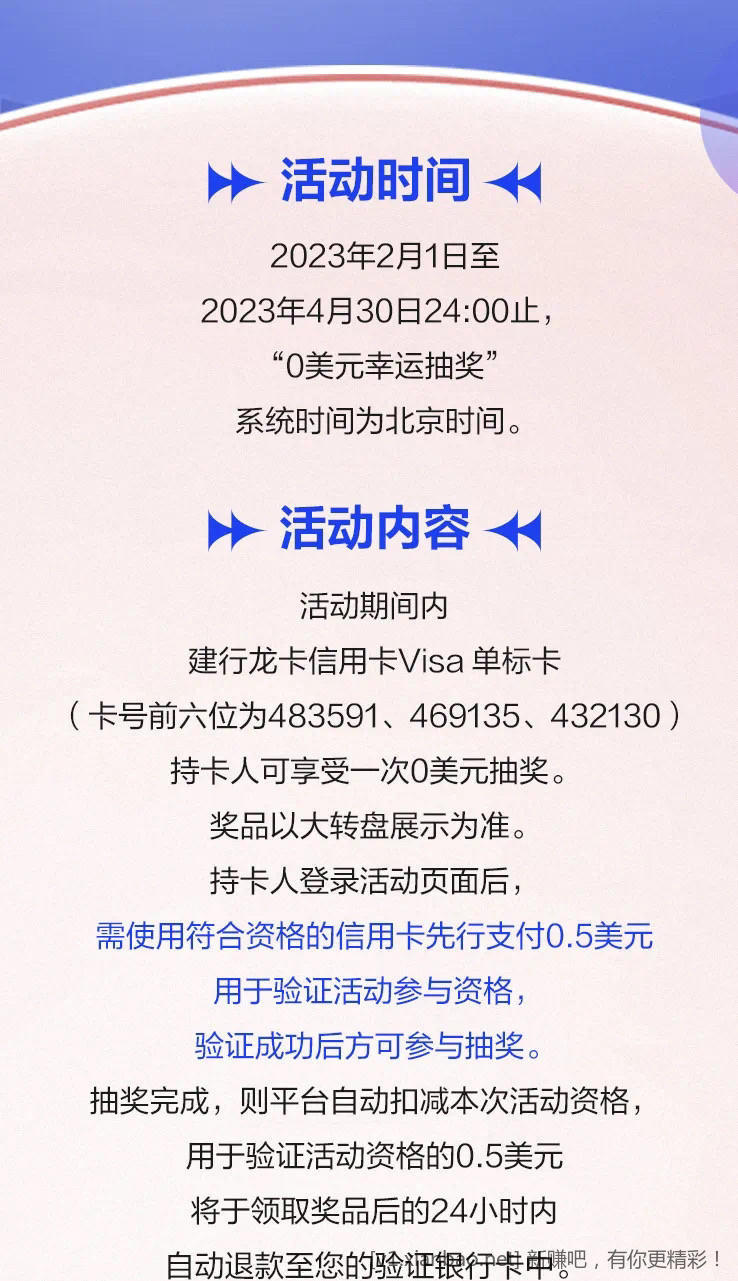 龙卡xing/用卡公众号,打开就能看到。建行visa 0元抽奖