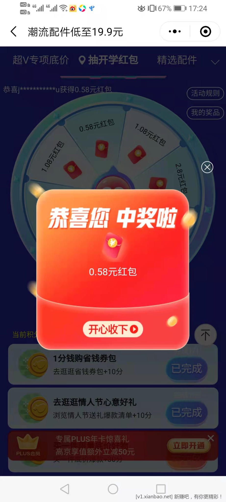 往下拉转盘,做两个浏览任务抽,几个号都中了0.58,小程序黑的号好像不中