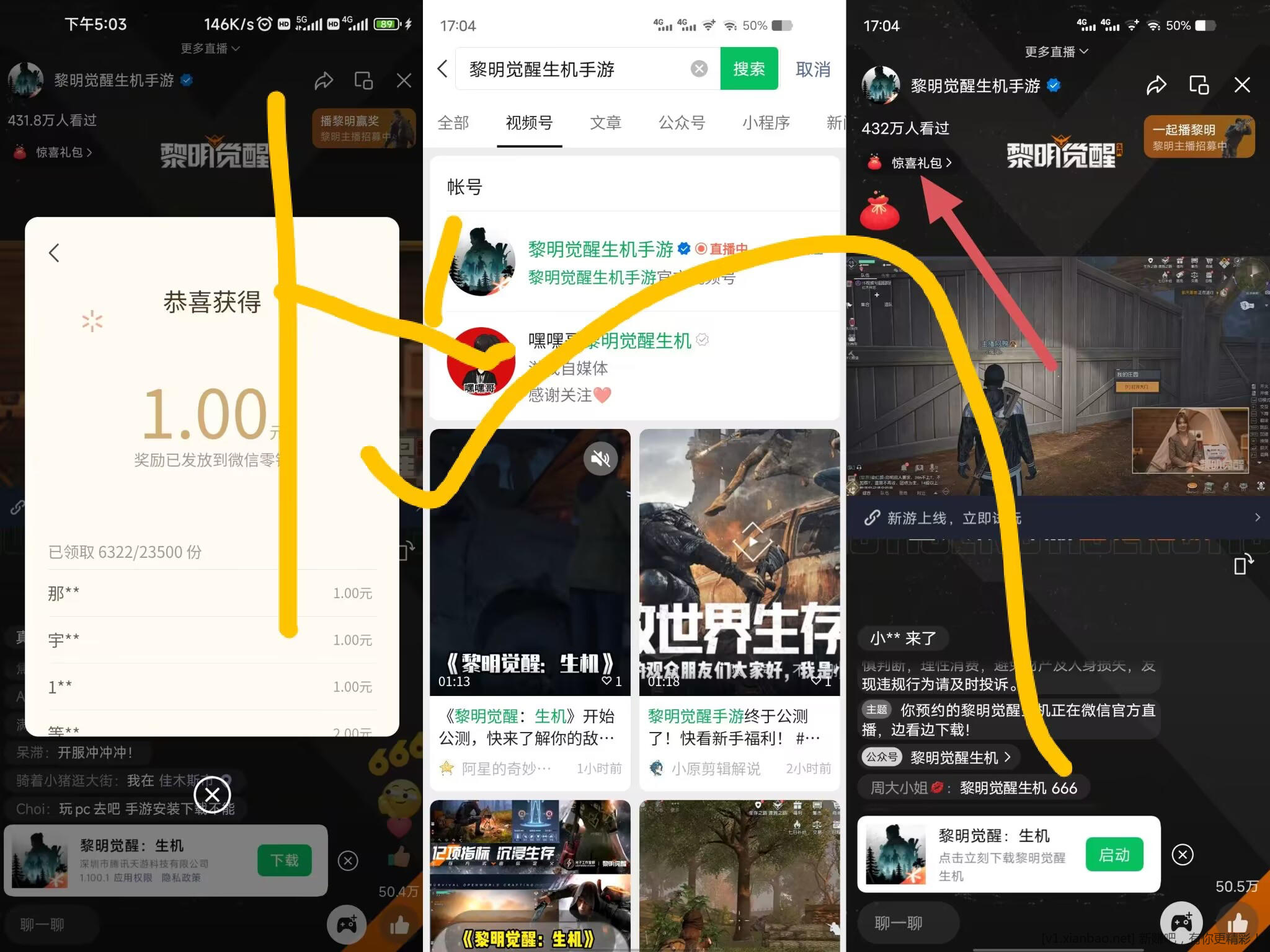 反馈 wx顶部搜索框 输入:黎明觉醒生机手游 视频号里进直播左上角惊喜礼包 抽鸿包(俩个)和鸿包封面 有1-2-5 不必中