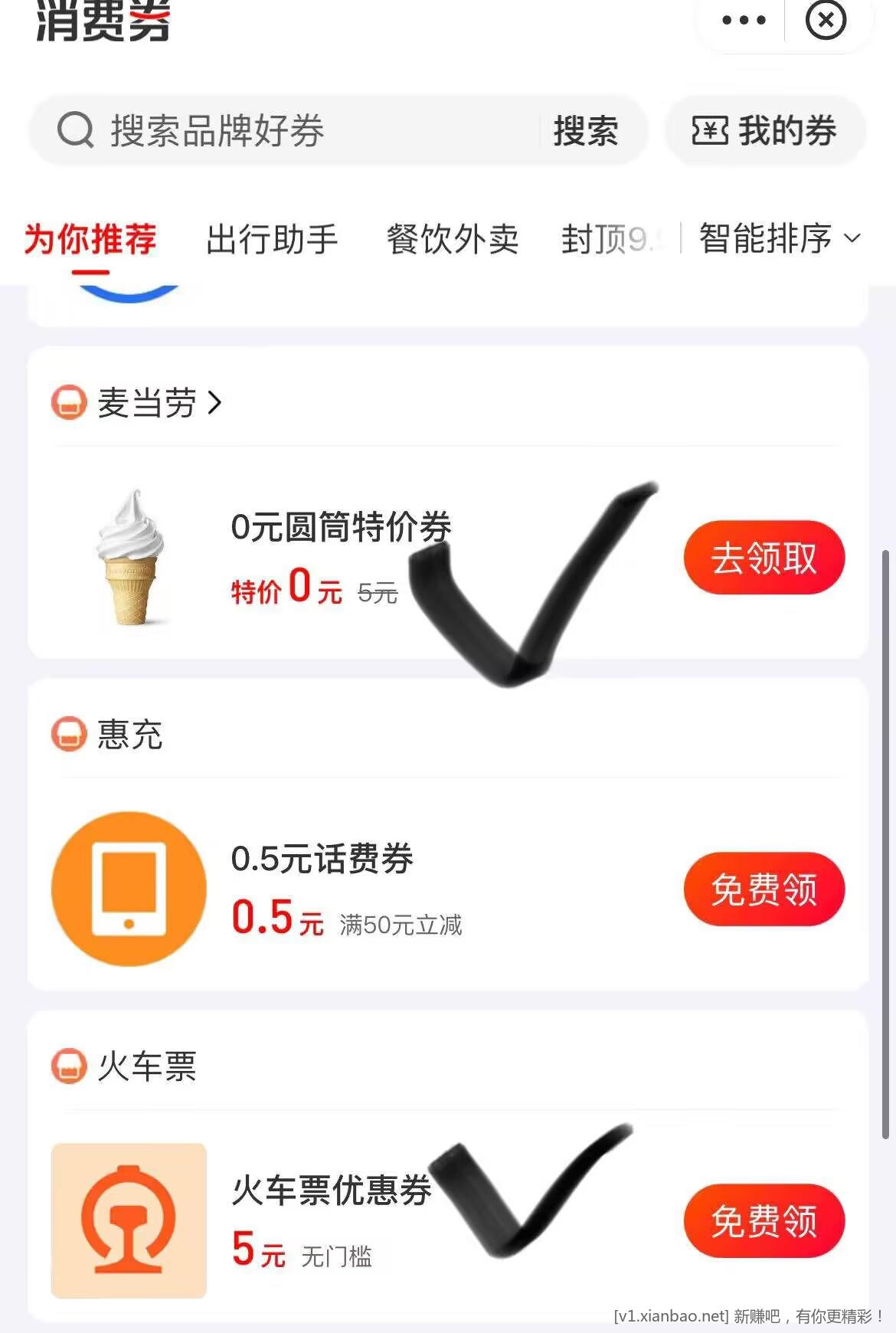 ZFB搜消费券 有0亓麦当劳 火车票5券按需