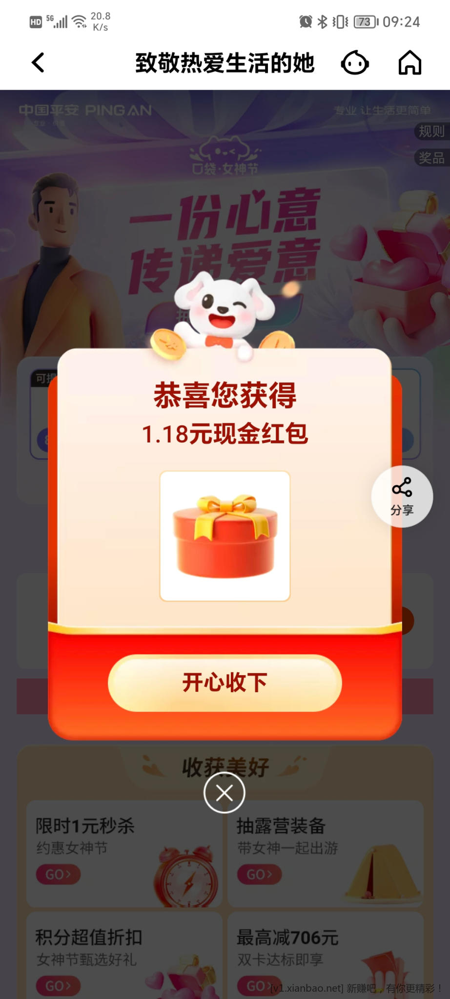 平安口袋银行搜“平安女神节”抽奖,还款券和现金红包,现金红包可直接提现
