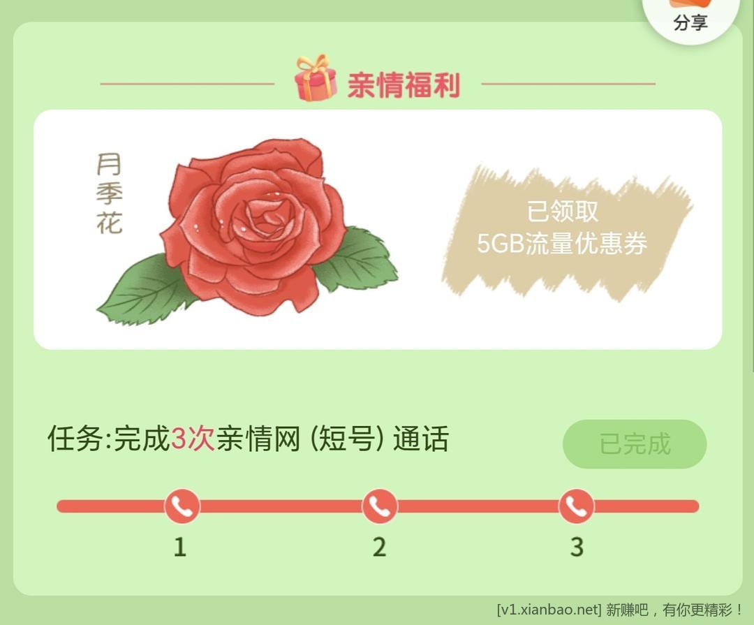 中国移动浙江APP我的-每日福利-春暖花“惠”开,拉到最下面有一个亲情福利。点去拨打跳转到拨号页面再返回就行。非直接到账,需要到优惠券手动领取。