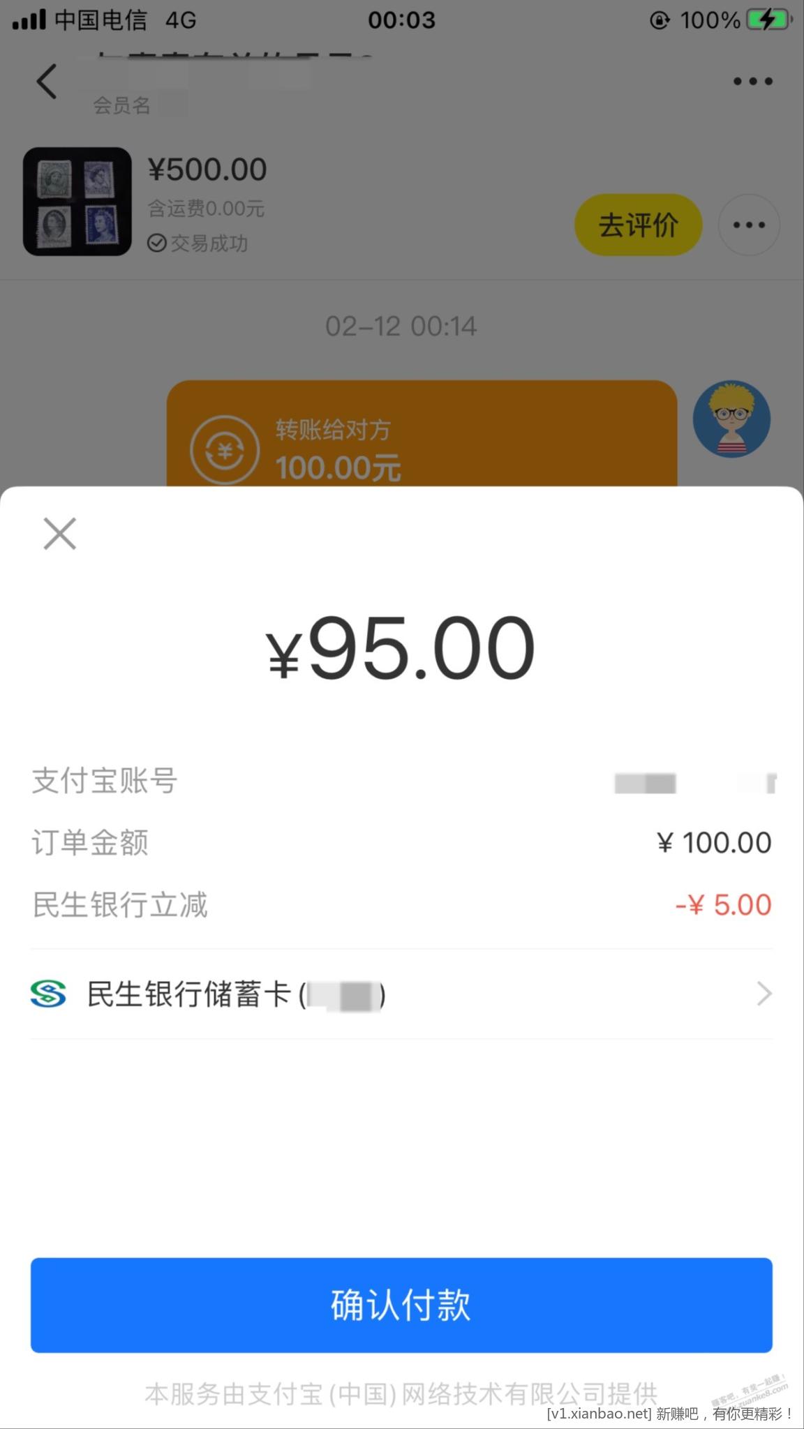 速度上,咸鱼转账 100-5 民生储蓄卡