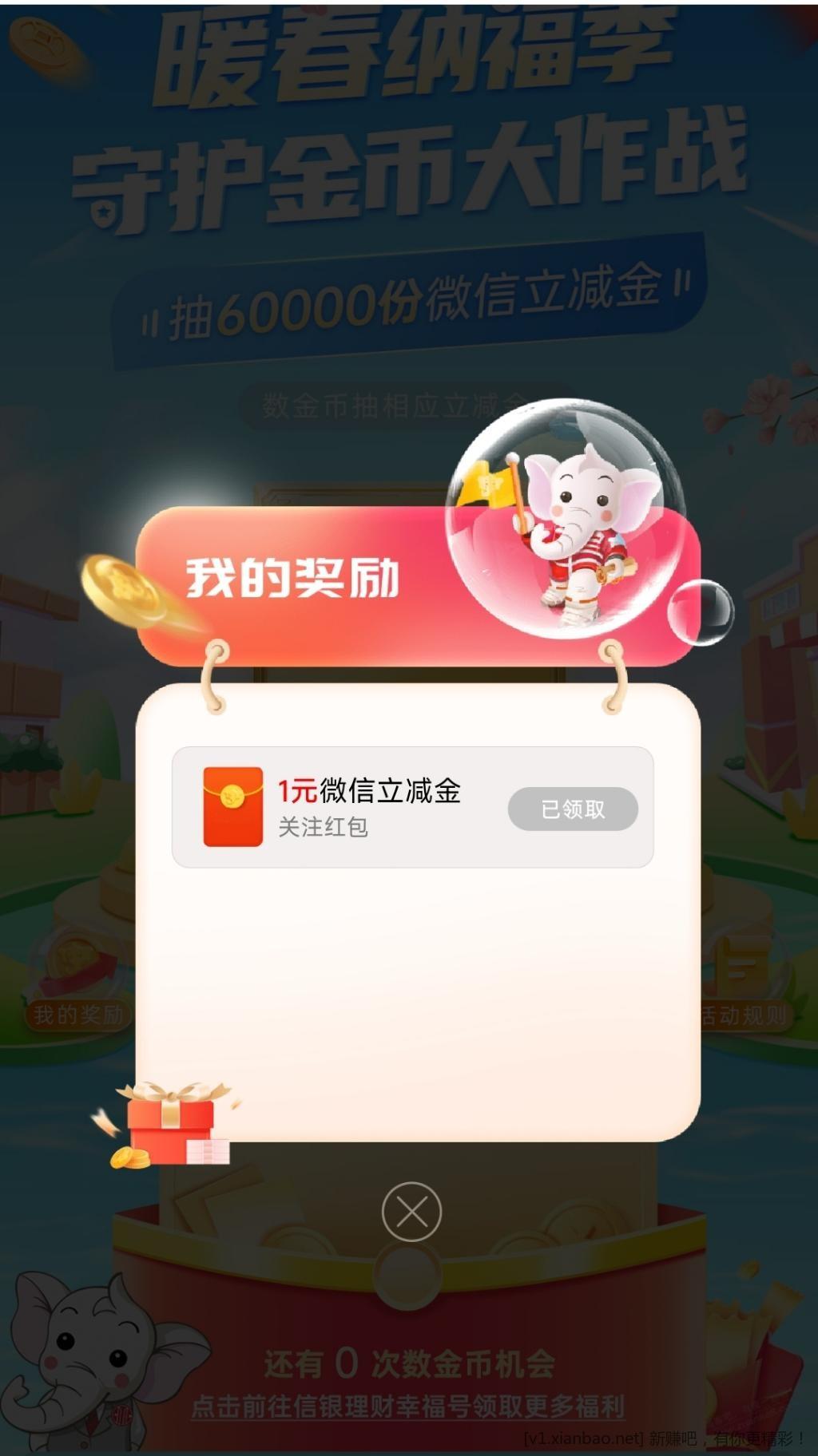 1、中信银行APP首页-暖春纳福 抽60000份微信立减金,进去后随便点一下即可获得1元微信立减金。