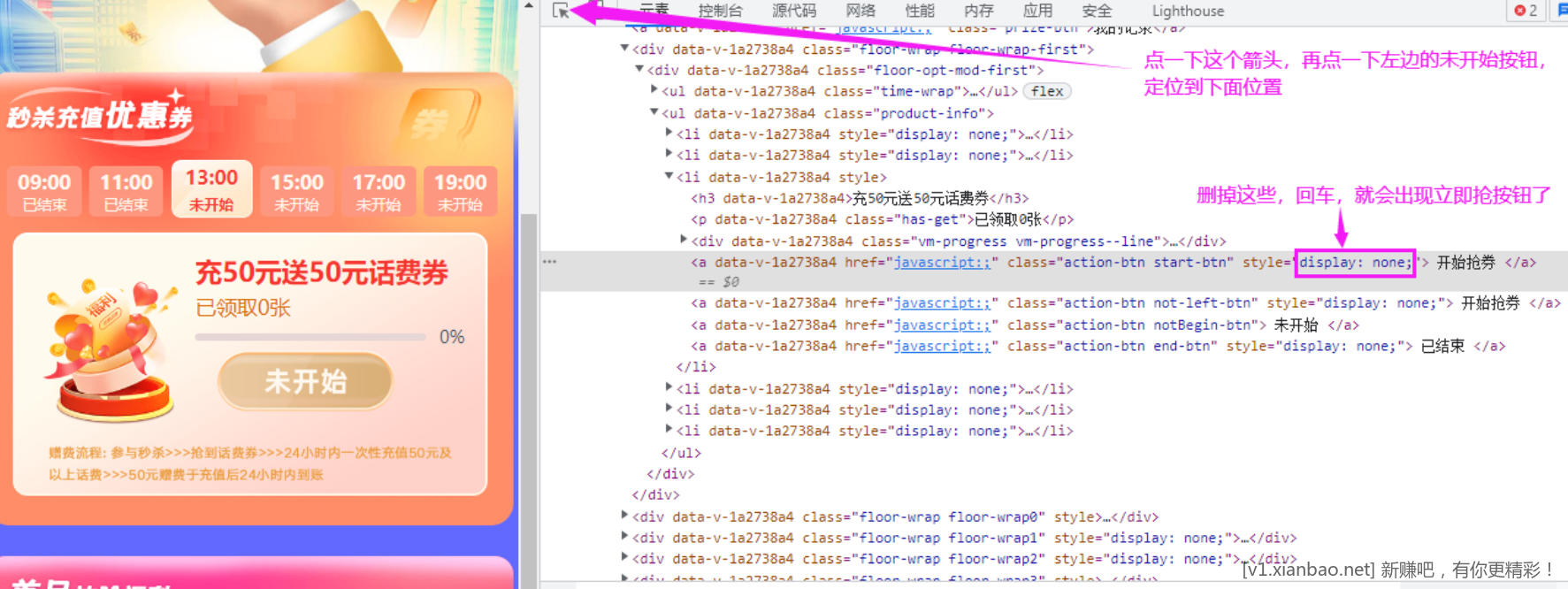 点一键登录,输入手机号登录,找到充50送50的横幅,进去在元素里按下图操作