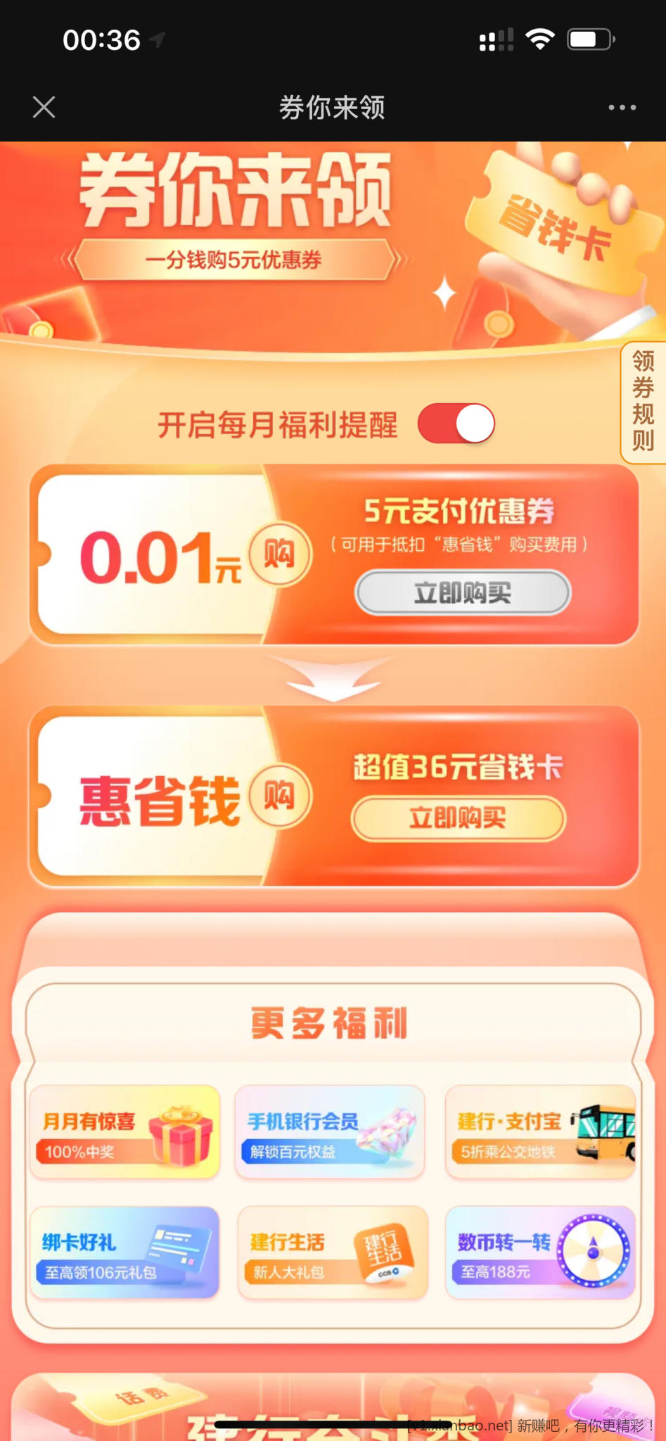 关注公众号Jian/行浙江分行,浙微有礼-券你来领。符合资格的用户可以0.01购买5元惠省钱支付抵扣券