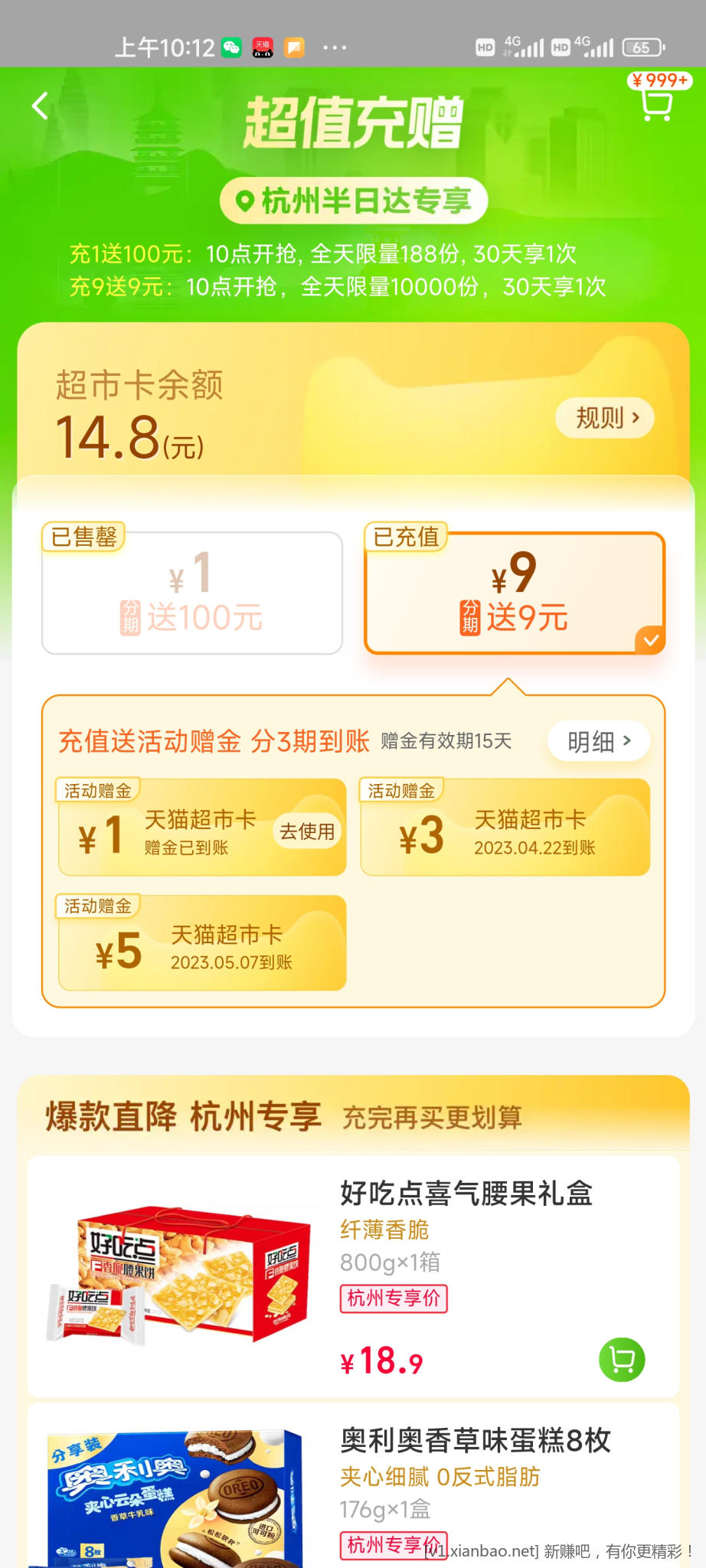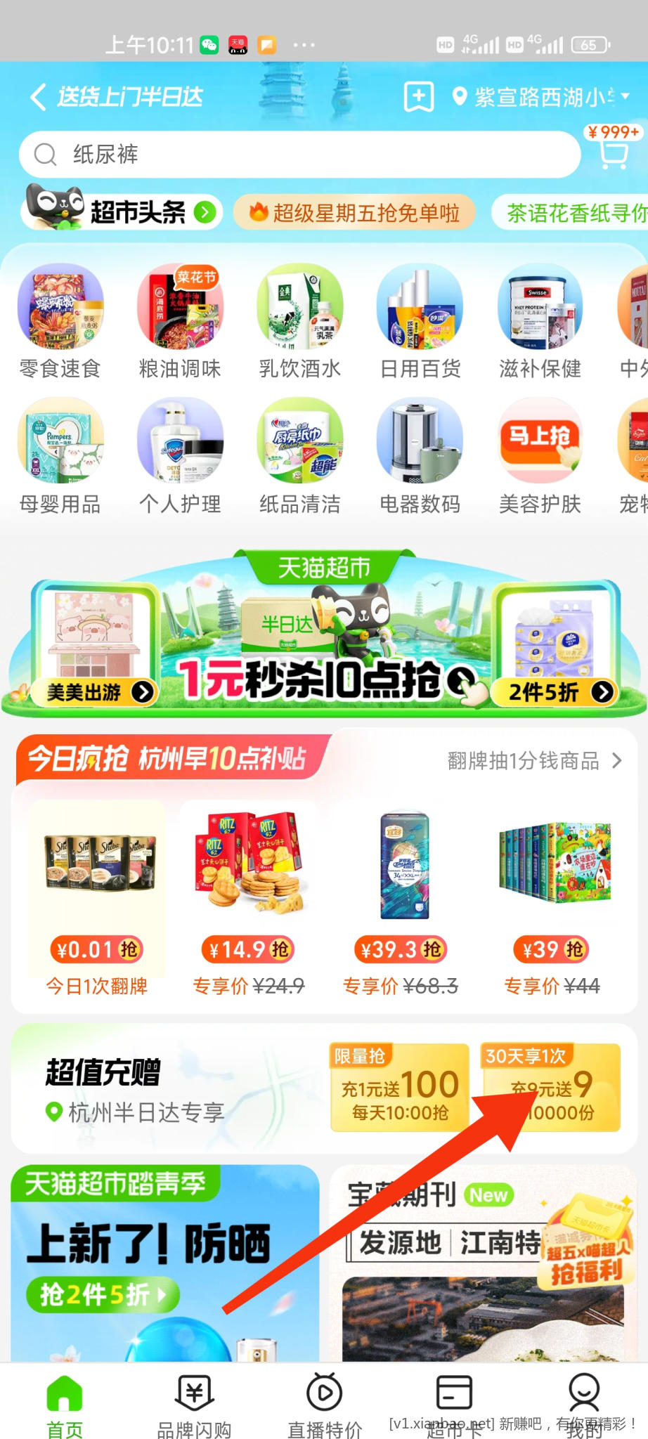 tb天猫超市,定位杭州 充9送9还有名额,想买的抓紧去