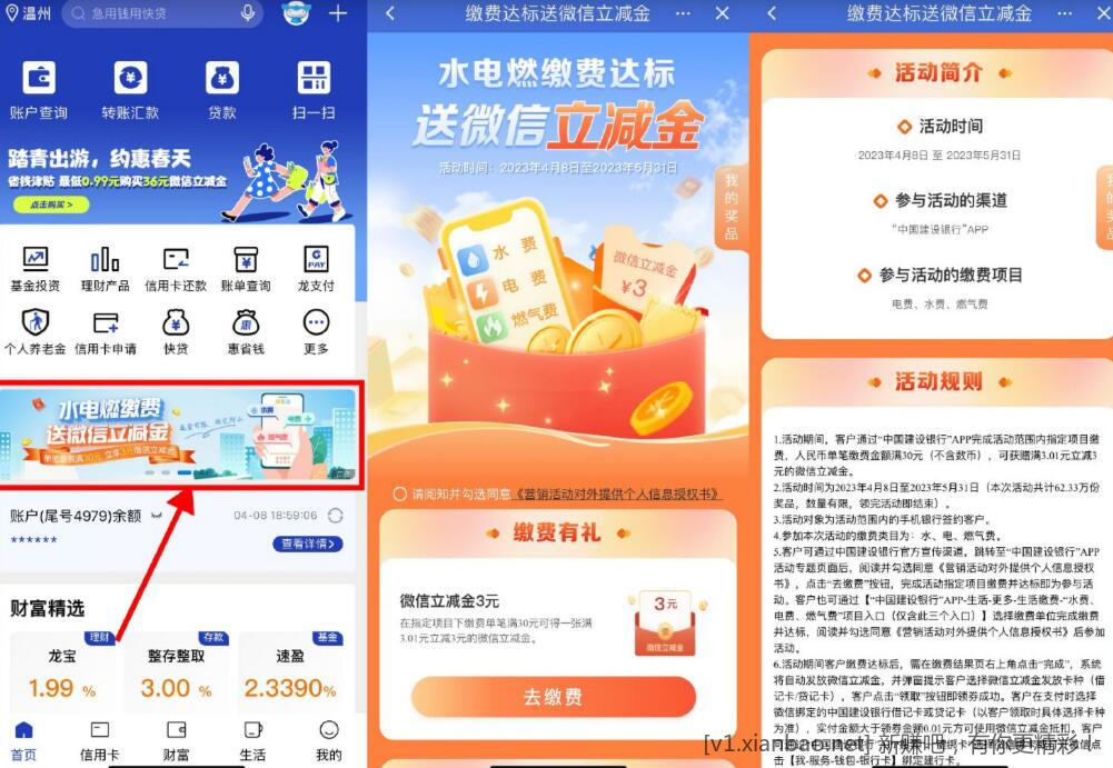 1、建行APP首页横幅进入->充水、电、燃气费满30元送3元微信立减金2、立减金共62万份,活动截止到5月31日,这两个月正好充水电费的上!