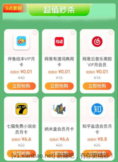 打开地址->黄金会员0.01元抢网易云音乐月卡->铂金/Plus会员12点整3元抢优酷、哔哩哔哩月卡等,直充秒到