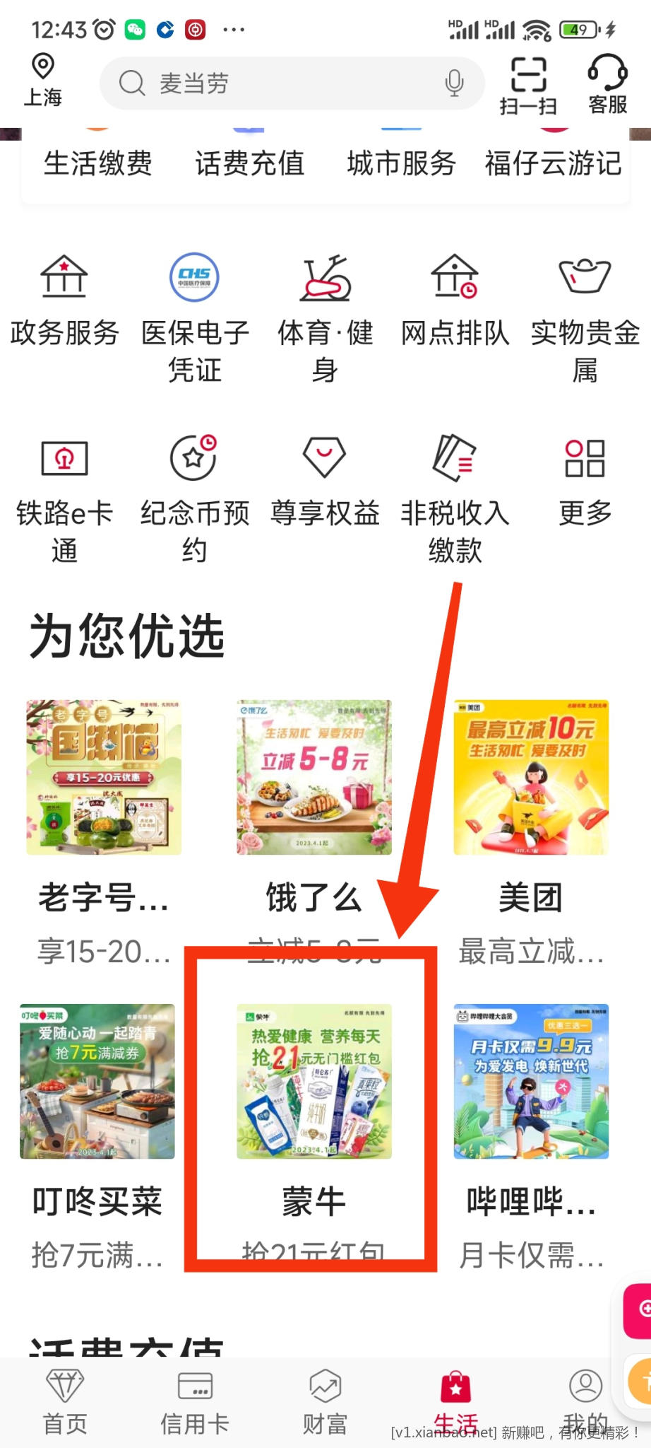 中行生活,定位上海,中间蒙牛进去领券15元,买16.9那个,对比一下牛奶如果可以的合适也可以买