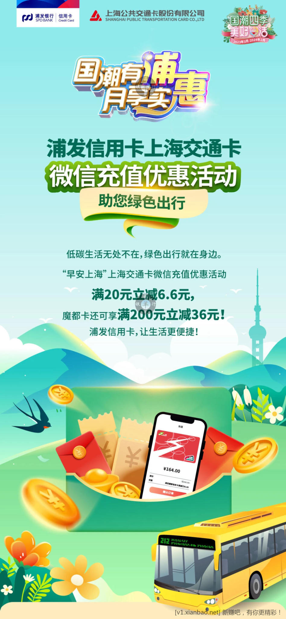 1、浦发xing/用卡,每周一10点,上海交通卡APP充值,微信消费,满20减6.6元,共限1次,每周1600名额