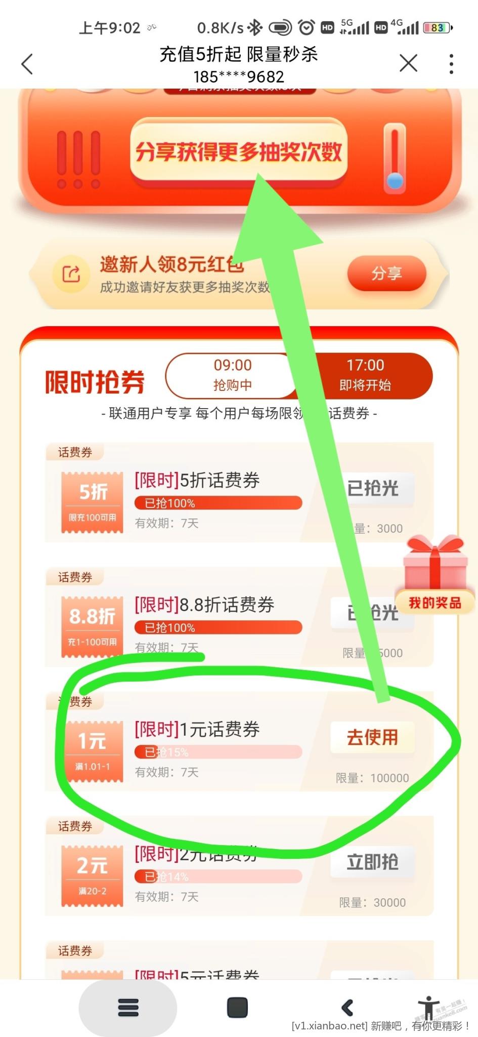 联通app右上角抽奖,五折抽话费,下拉,还剩8000+
