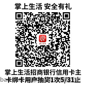 掌上生活安全有礼,招商银行xing/用卡主卡绑卡用户,可抽奖1次,5/31止。