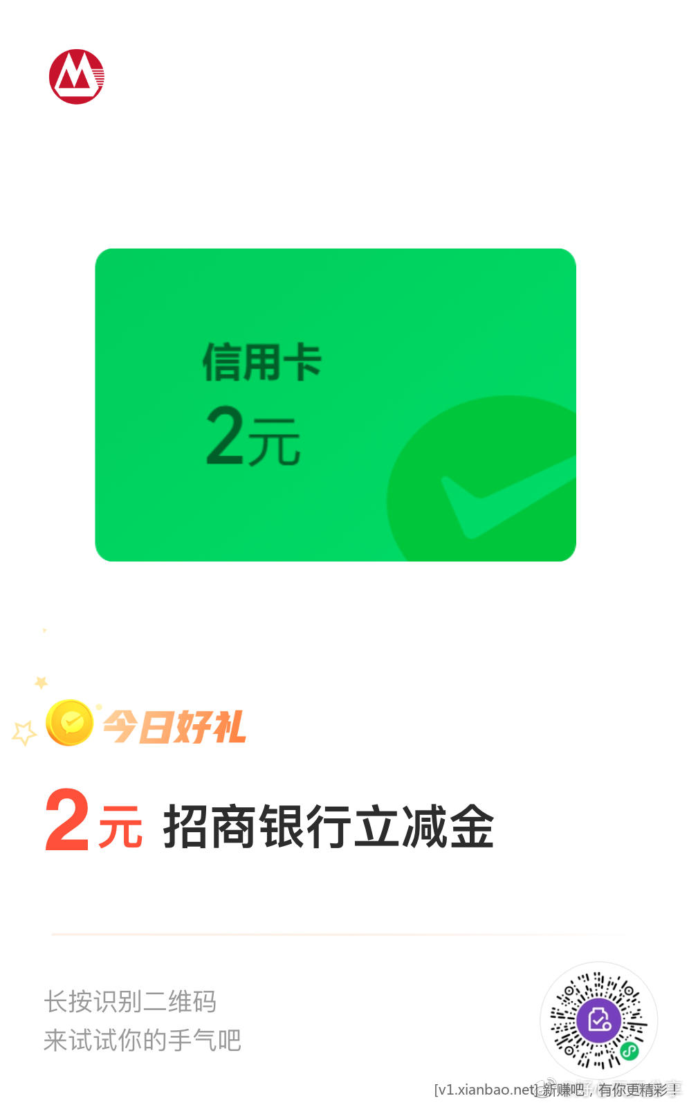 【招行xing/用卡】微信扫有新的兑换2元立减金