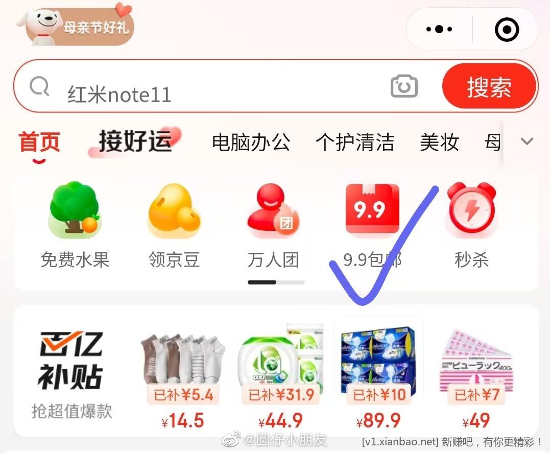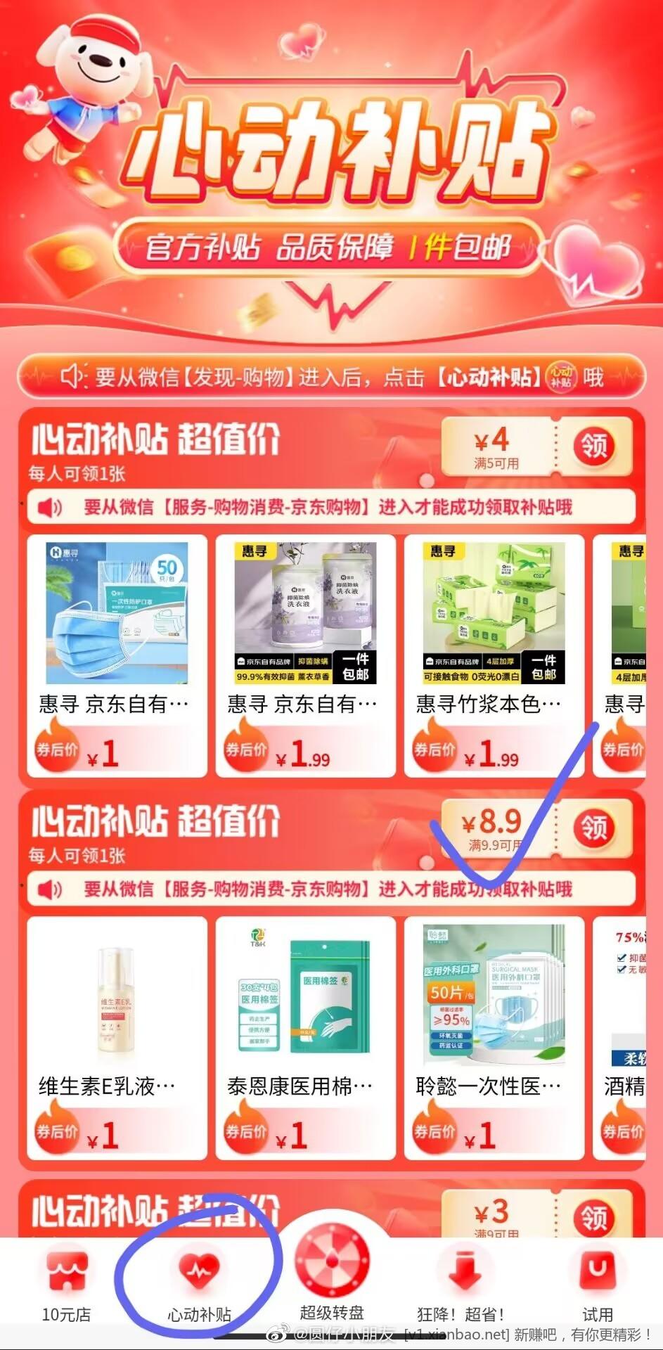 微信小程序:京东购物→9.9包邮→底部心动补贴