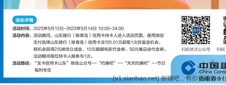 山东建行公众号母亲节1分抽奖,我中了2元微信立减金,好用荚果