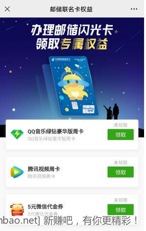 微信公众号【邮储联名卡】点菜单栏【闪光卡】-【专属权益】进去活动里领