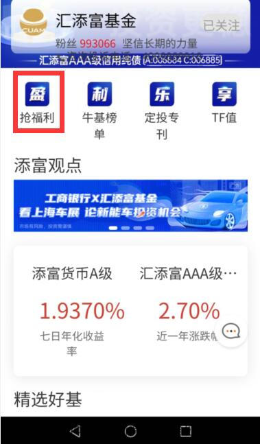 打开 工商银行app,搜索 汇添富基金,点 场景号-汇添富基金,点 抢福利,即可领取8888元基金体验金