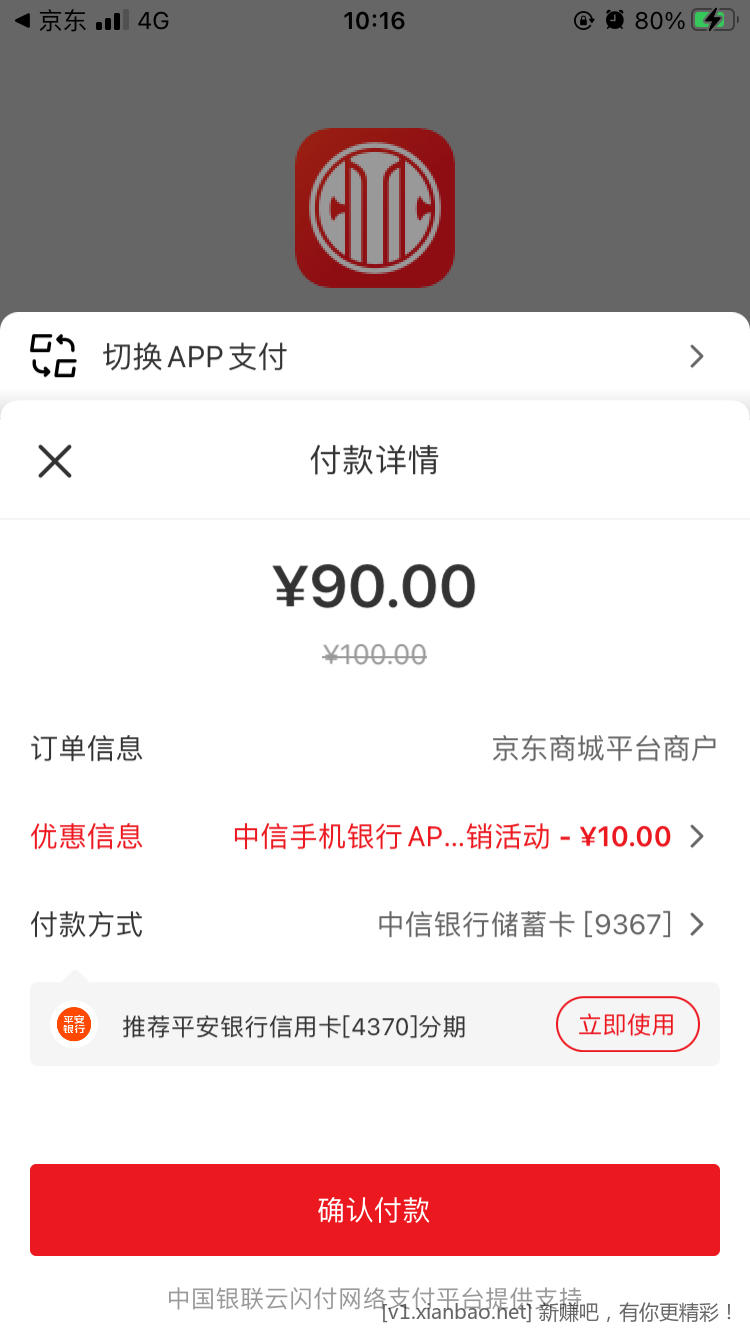 100京东实体卡,中信app立减10