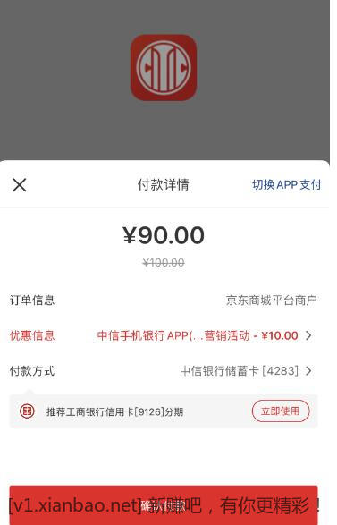 京东买100e卡实体卡,选ysf付款,跳到中信银行app(以前开过ysf付款功能都可以)立减10,每天10点发名额,ysf搜:中信,可查剩余名额,就1次机会