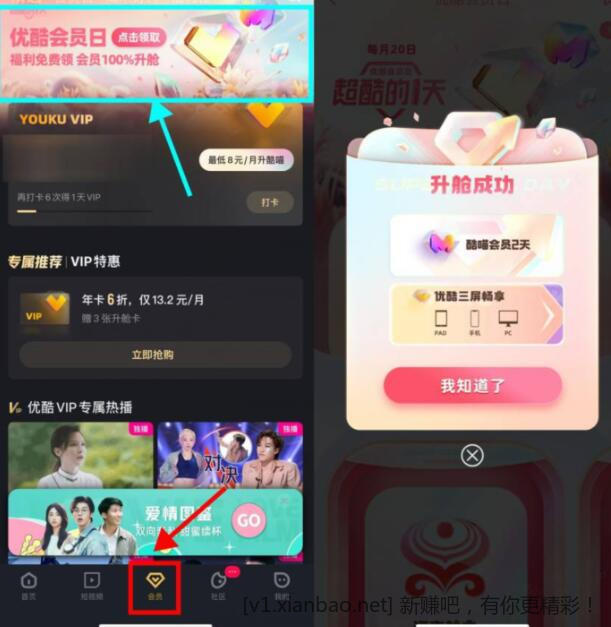 优酷APP底部“会员”->优酷会员日->进入自动弹出升级卡,直接升级1~3天酷喵会员,可在电视上使用酷喵会员