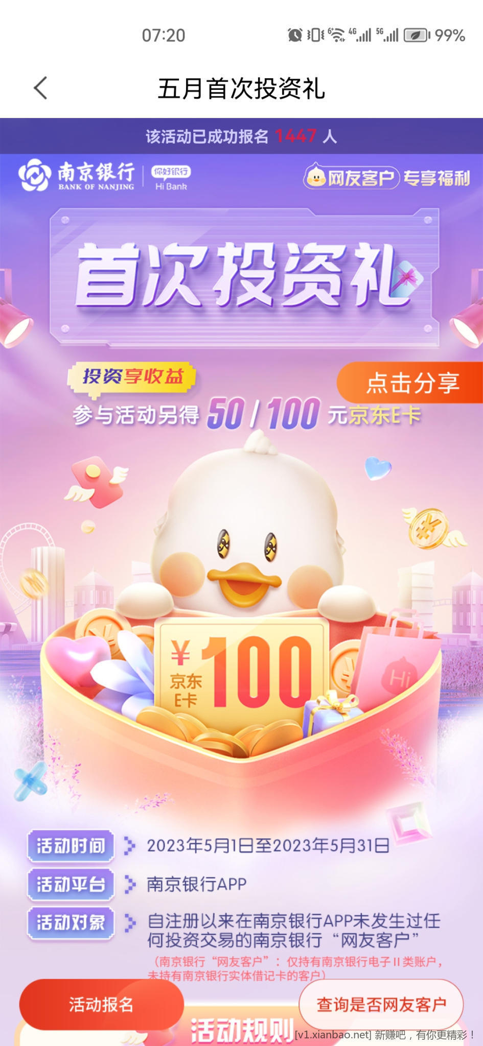 南京银行,不限新老,只限二类户从未在南京银行投资理财过的用户。买5000理财,可以是日开放的理财。次月16日后可以领50E卡。新用户签到页领取5000积分,可以额外5000积分+0.01元兑10E卡。名额5000,现在1447。具体规则自己看。能邀请到人的额外50E卡。