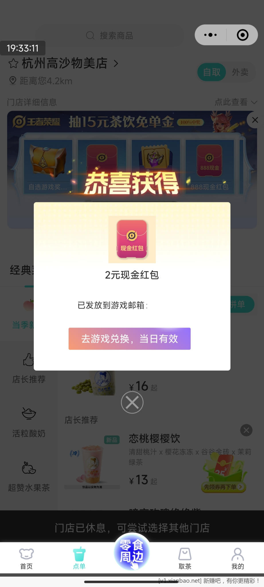 微信沪上阿姨点单小程序-底部点单-随便选一个门店进去-2次抽奖机会-登陆游戏领取